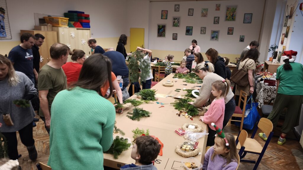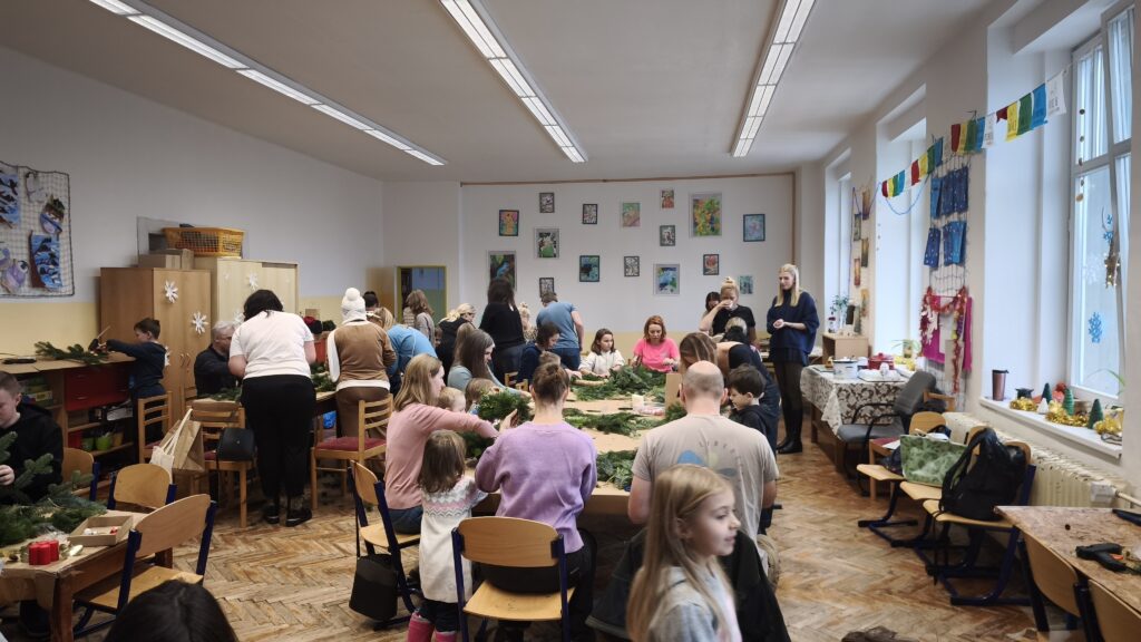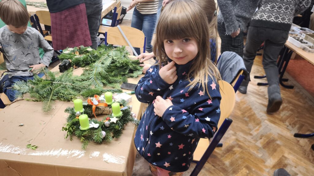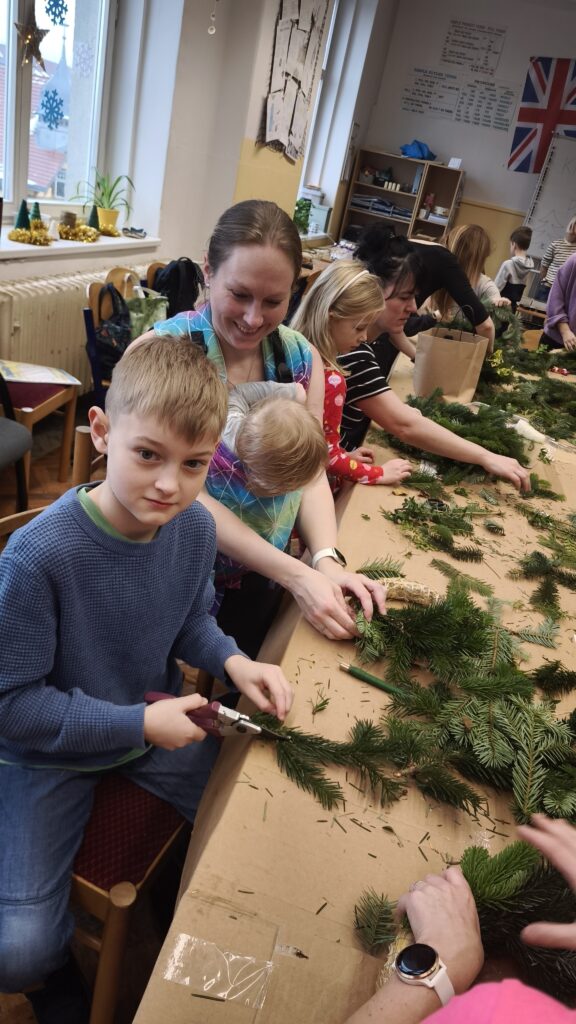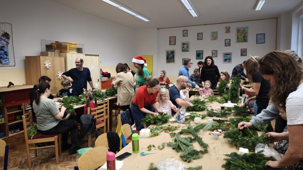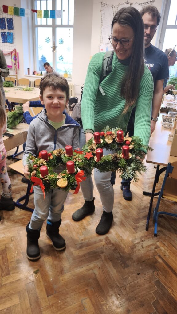 V průběhu sobotního dopoledne 29. listopadu si mohli naši prvňáčci s rodiči, učitelky a ostatní kolegové vyrobit své originální adventní věnce.